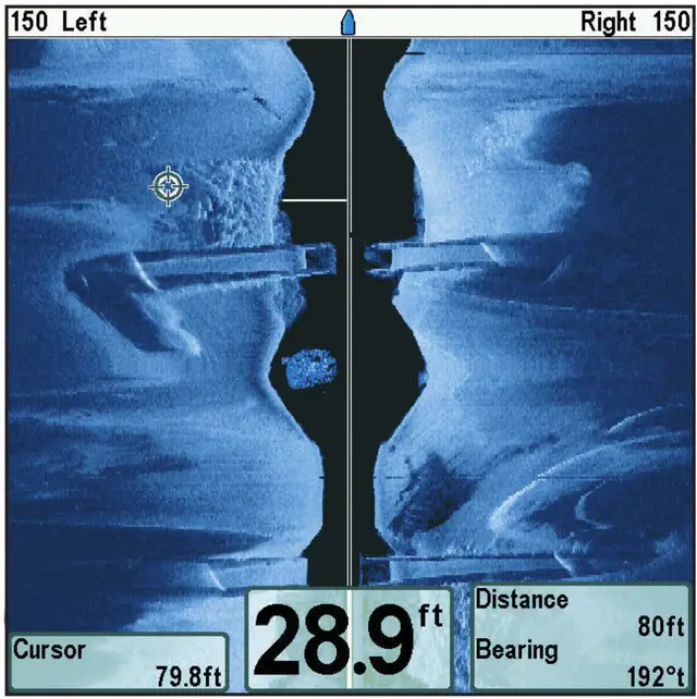 У боковому режимі тінь завжди падає від об’єкта у протилежний бік від джерела променя. Якщо бачите світлу пляму з темною смугою поруч — це може бути або камінь, або велика риба, що зависла над дном. Висота об’єкта визначається довжиною тіні: чим вона більша, тим вищий предмет.
