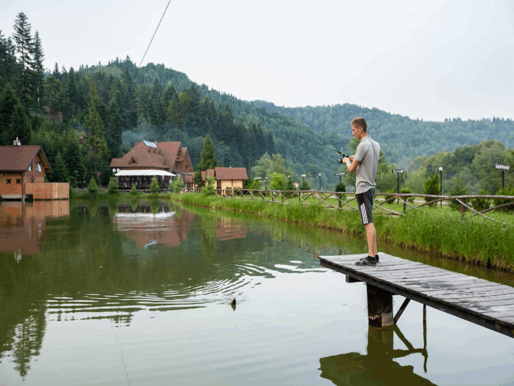 Ці місця працюють офіційно до пізньої осені, а більшість — і взимку. Вони мають водойми, де можна рибалити прямо біля житла або за кілька хвилин ходьби. Осінній Карпатський клімат сприяє спокійній ловлі: менше вітру, стабільна температура води й мінімум людей.